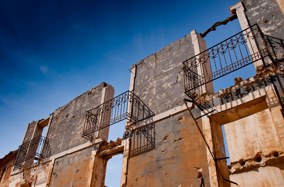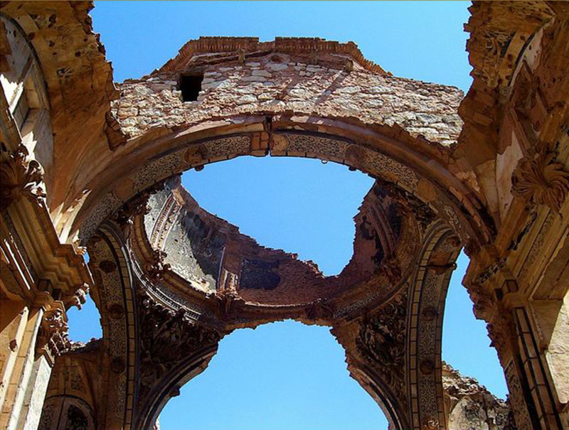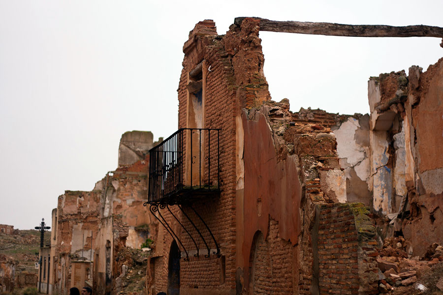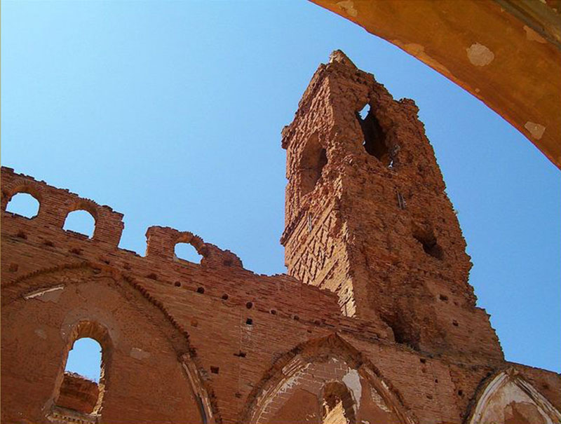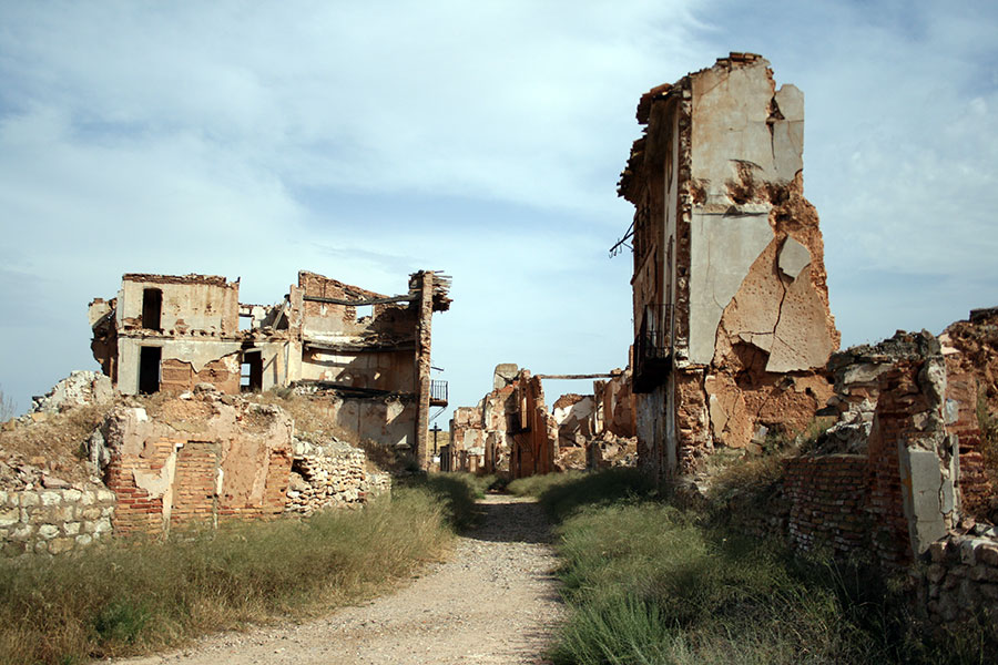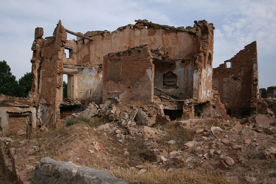 Pasear por las calles del Belchite antiguo es una experiencia sobrecogedora. En algunas paredes aún se pueden observar los impactos de las balas. Si dejas volar la imaginación, aún puedes ver los sacos terreros formando barricadas en las calles, los soldados apostados tras las ventanas con los fusiles encarados y los cráteres que los bombardeos han dejado en por todos lados.