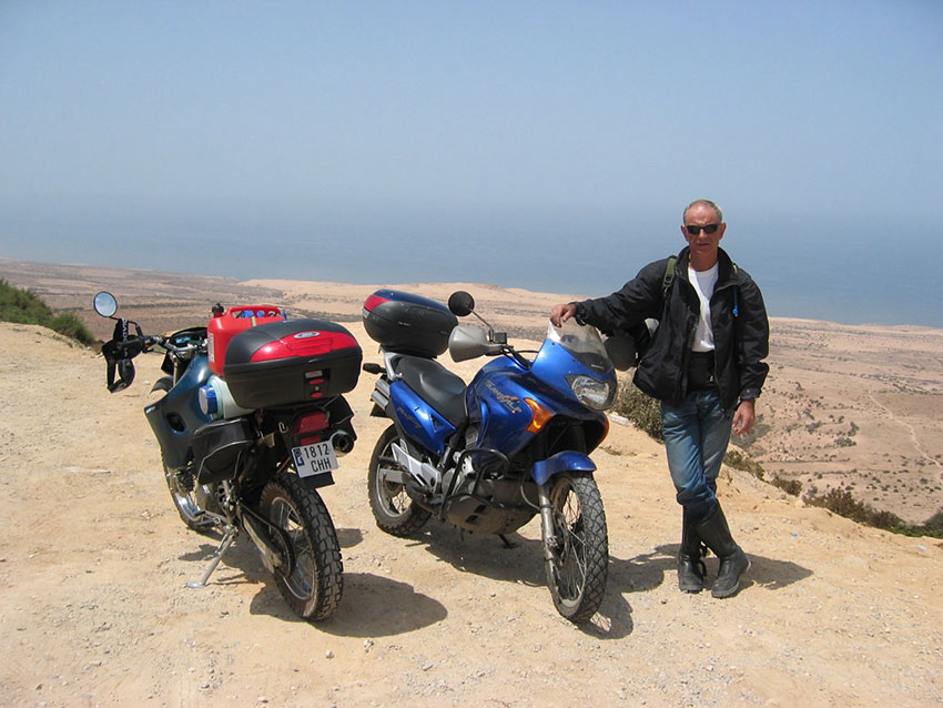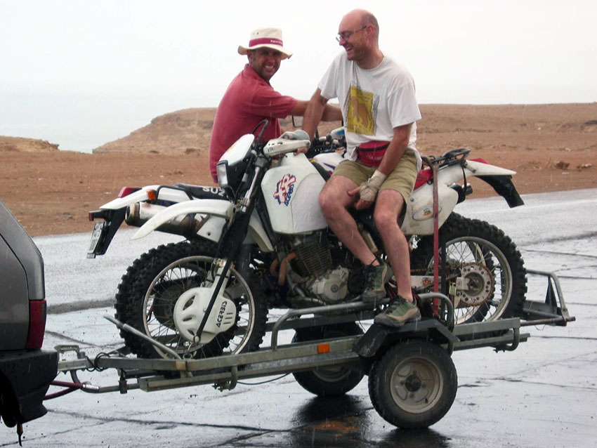 La carretera corría paralela a la costa, por lo que se hizo algo menos monótona que el día anterior. La playa se sucedía de forma ininterrumpida, al pie de imponentes acantilados. Nos daba la impresión de que todo el Sahara era un inmensa playa con miles de kilómetros de profundidad. De forma imprevista, comenzó a llover torrencialmente, algo poco habitual en el desierto. No había donde guarecerse, y nuestros compañeros de las motos se calaron hasta los calzoncillos. Tuvimos que parar porque la carretera estaba anegada y tenían dificultades para poder seguir. Cuando la lluvia remitió, el desierto parecía un lago, porque la tierra no había sido capaz de absorber tal tromba de agua.