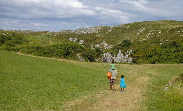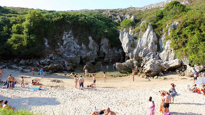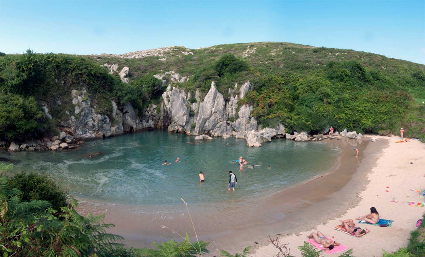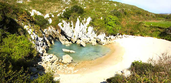 Una pequeña playa, que responde al extraño nombre de Gulpiyuri, orgullosa y algo cabezota, se empeña en darle la espalda al mar. Es una de las playas más bonitas, mágicas y curiosas que conozco y, si algún día vais por Asturias, os aconsejo acercaros a visitarla. Gulpiyuri está en el interior, pero no es una playa fluvial, ni de pantano, es una playa de mar, como Dios manda; con su agua salada, su arena y hasta con un pequeño acantilado. El caso es que el agua de mar fue, poco a poco, erosionando y formando una cueva en un acantilado kárstico. El agua penetró por la cueva hacía el interior y acabó hundiendo el terreno que estaba al otro lado del acantilado, a unos 100 m. de la costa, creando un fenómeno geológico que se llama dolina y que, al llenarse de agua de mar, formó la playa. La playa tiene muy poca profundidad y es chiquitita, ya que apenas caben 20 personas, pero es bellísima. Seguro que en los tiempos de la magia, esta concurrida por trasgos, anjanas y trastolillos.