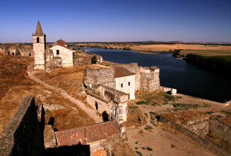 Juromeha es un pequeño pueblo amurallado que domina altanero, desde un altozano, el río Guadiana y la frontera con España, que era desde donde venía casi siempre el peligro. Quizás penséis que de esos hay un montón en Portugal y en España, pero lo singular de Juromenha, es que la ciudad antigua se abandonó por completo en el siglo XIX, para construir un nuevo enclave a escasos metros del antiguo. Algo parecido a lo que ocurrió con Castellar de la Frontera. La ciudadela o castillo, quedó tal como la dejaron sus habitantes, aunque ahora está algo más destrozada por efecto del vandalismo y del paso del tiempo, que a veces es más vándalo que nosotros mismos, que ya es decir… ¡como se las gasta el tiempo! Juromeha es un enclave que ha sufrido innumerables cambios desde su fundación. El pueblo que podemos visitar en la actualidad, es una fortaleza de sistema Vauban, cuya construcción data de siglo XVII. Tiene la estructura en estrella característica de estas construcciones, altas murallas inclinadas para que las balas de cañón rebotaran y no dieran de lleno en la piedra, garitas de vigilancia rematadas con un tejadillo en forma de cúpula, como las que, por ejemplo, podemos ver en las murallas de Cádiz y unas impresionantes vistas sobre el río Guadiana, que por si solas, bien merecen la visita. En la iglesia, que aún se mantiene dignamente en pie, celebraron sus bodas el rey Alfonso IV de Portugal (1325-1357) con Beatriz de Castilla y su hija María de Portugal con el rey castellano Alfonso XI. Curiosamente su constructor, el ingeniero flamenco Cosmander, se pasó más tarde al bando español, ayudándoles a conquistar la fortaleza que el mismo edificó.