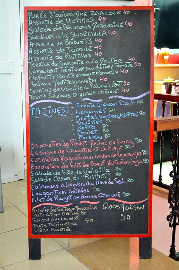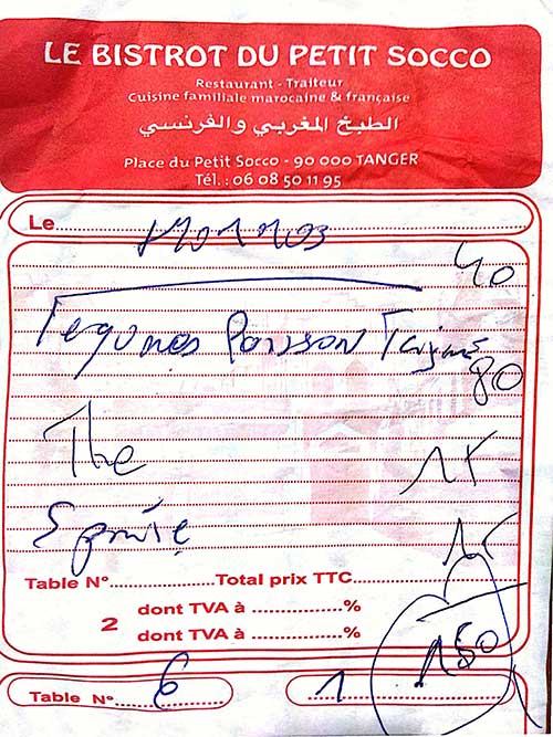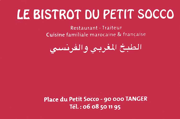 Tal y como su propio nombre dice, Le Bistrot du Petit Socco es un coqueto y sencillo restaurante situado en el zoco pequeño de Tánger. Un establecimiento en el que poder comer muy bien, a un precio razonable y con un servicio excelente. No es, ni por su decoración, ni por su cocina, el colmo de la sofisticación, pero es justo lo que busca un viajero inusual; cocina a buenos precios y en un local amigable y con cierto encanto, huyendo de los artificios cool a la moda. La carta suele variar dependiendo de la compra del día en el mercado pero, básicamente, se compone de platos tradicionales marroquíes con un toque francés aportado por Brigitte, la excelente cocinera y copropietaria del local. Las labores de recibir, aconsejar y servir a la clientela, las desempeña de maravilla Didier, su encantador y atento compañero.